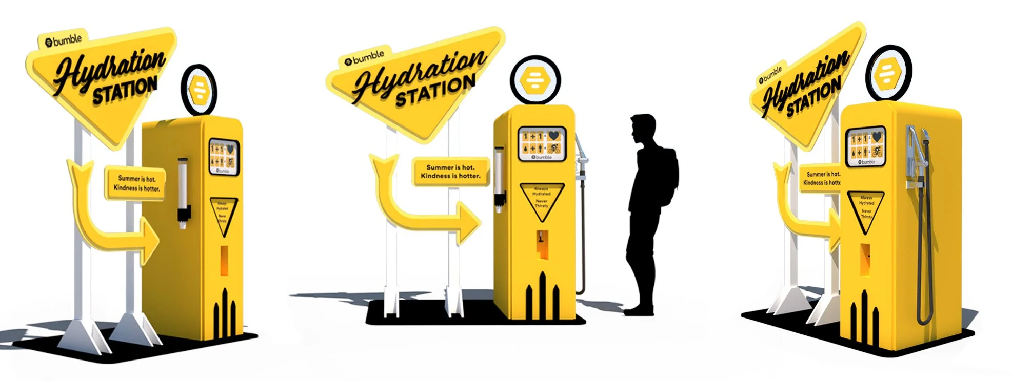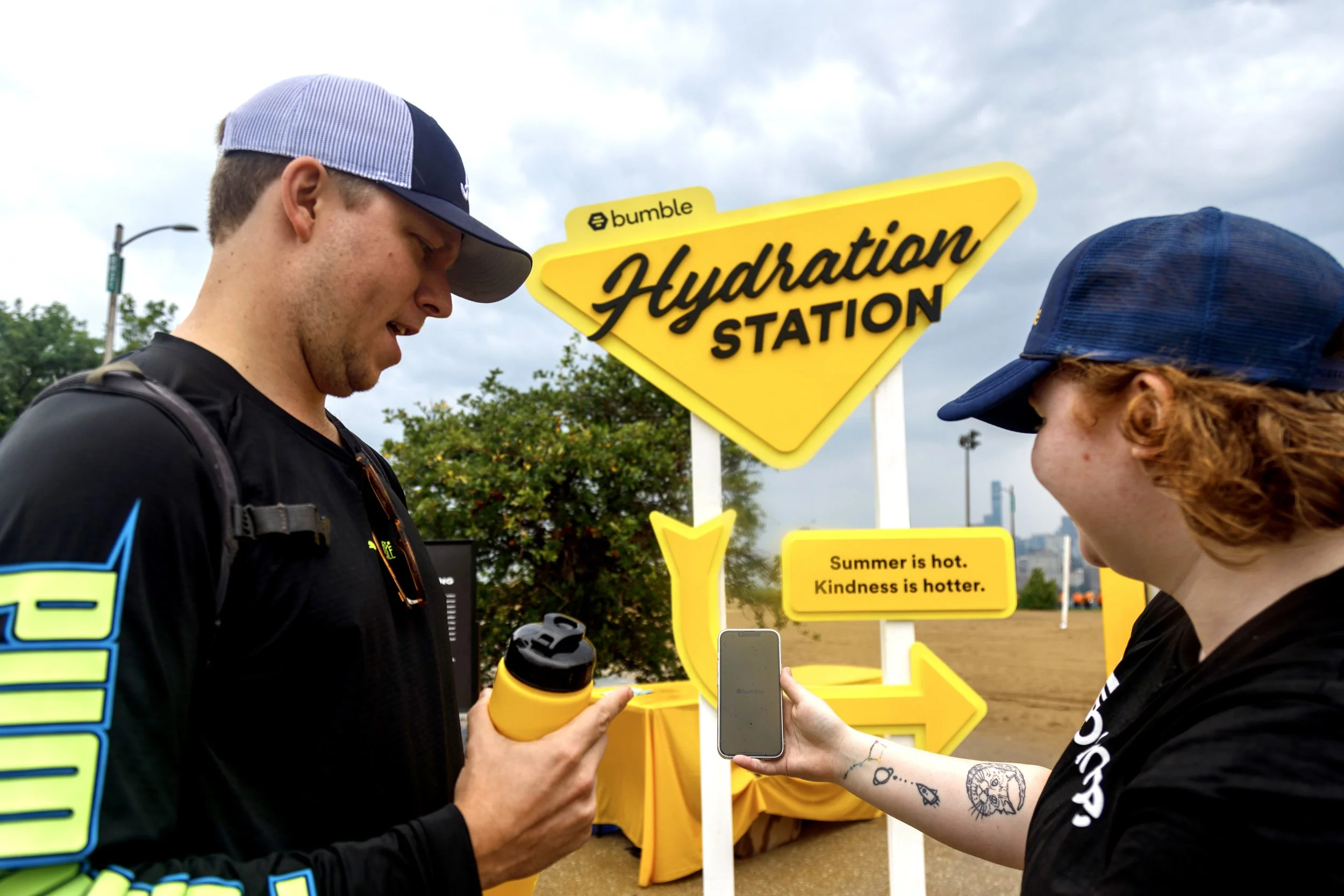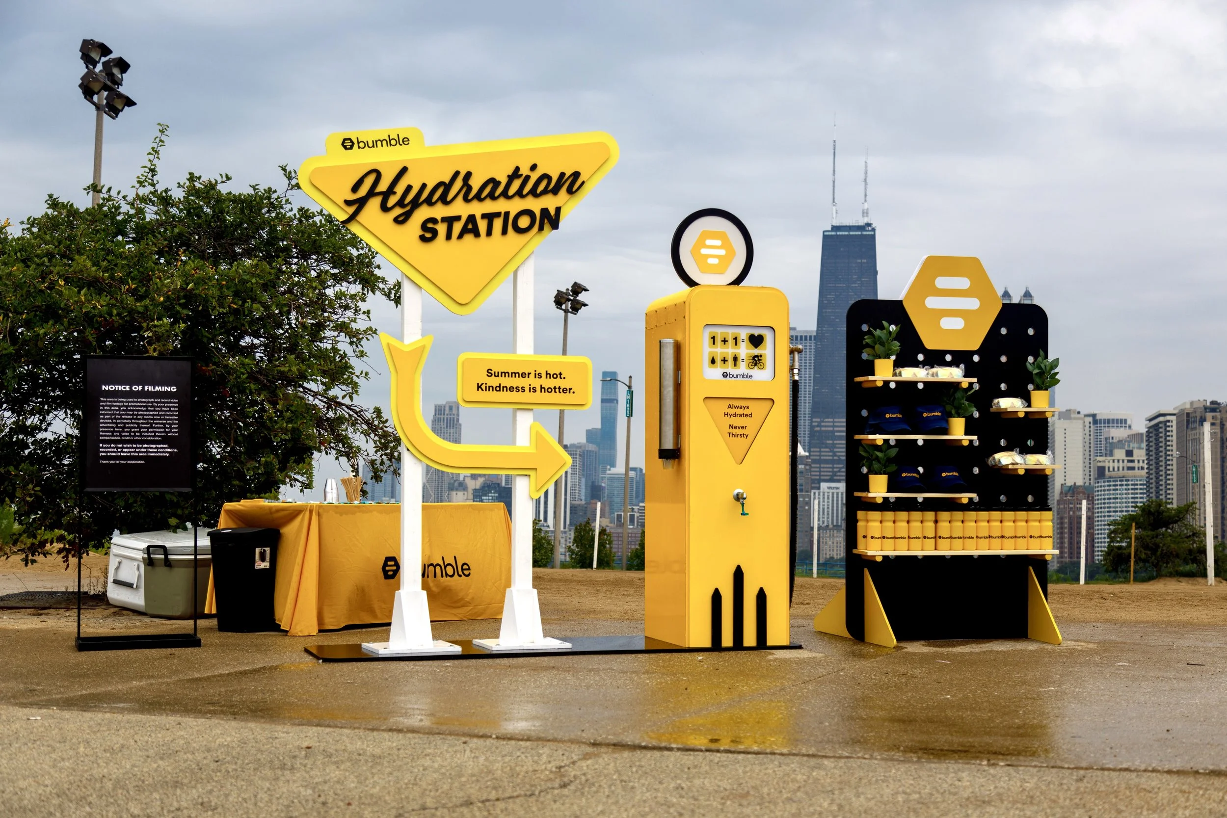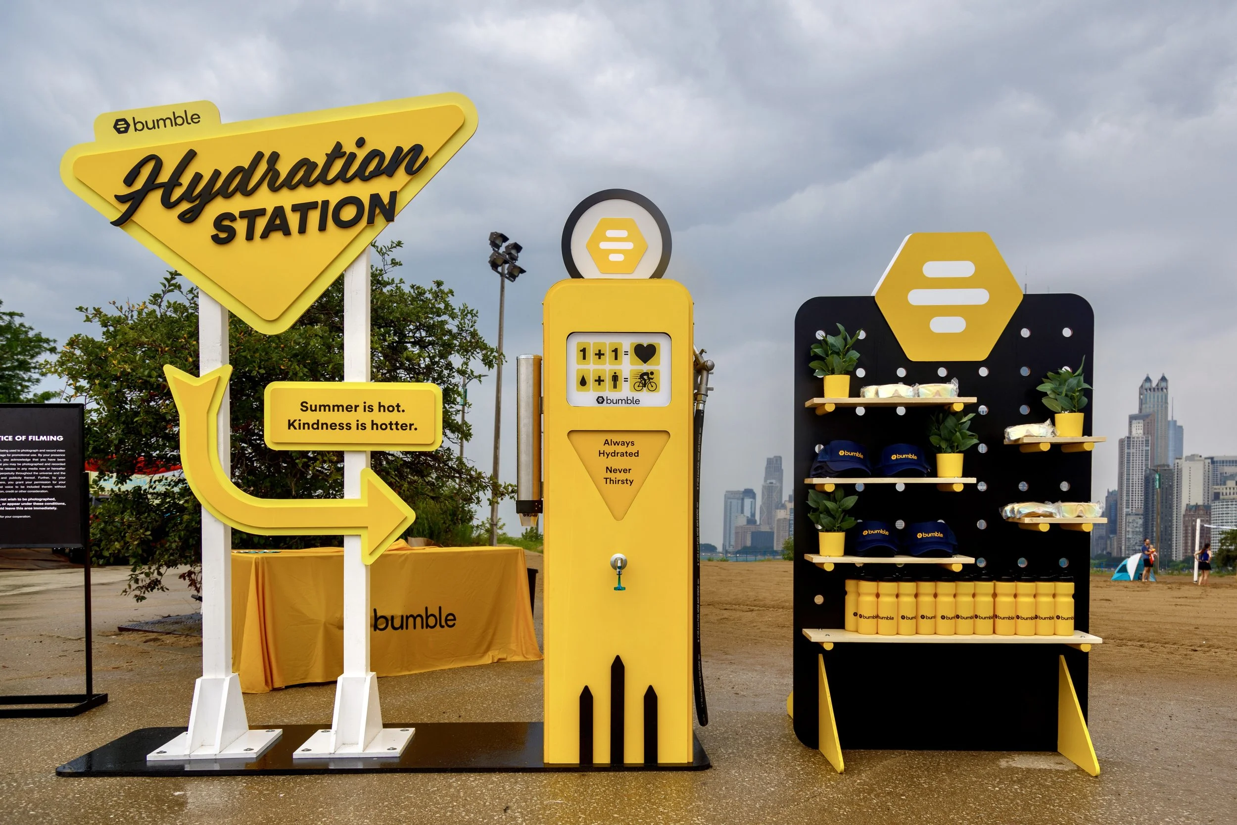Bumble partnered with Liquid IV to launch their first traveling hydration station. Meant to harken back to a mid-century fuel station, this watering hole wouldn't be out of place on Route 66. This has activated at Chicago parks and will continue to activate the summer of 2023 in various US cities.