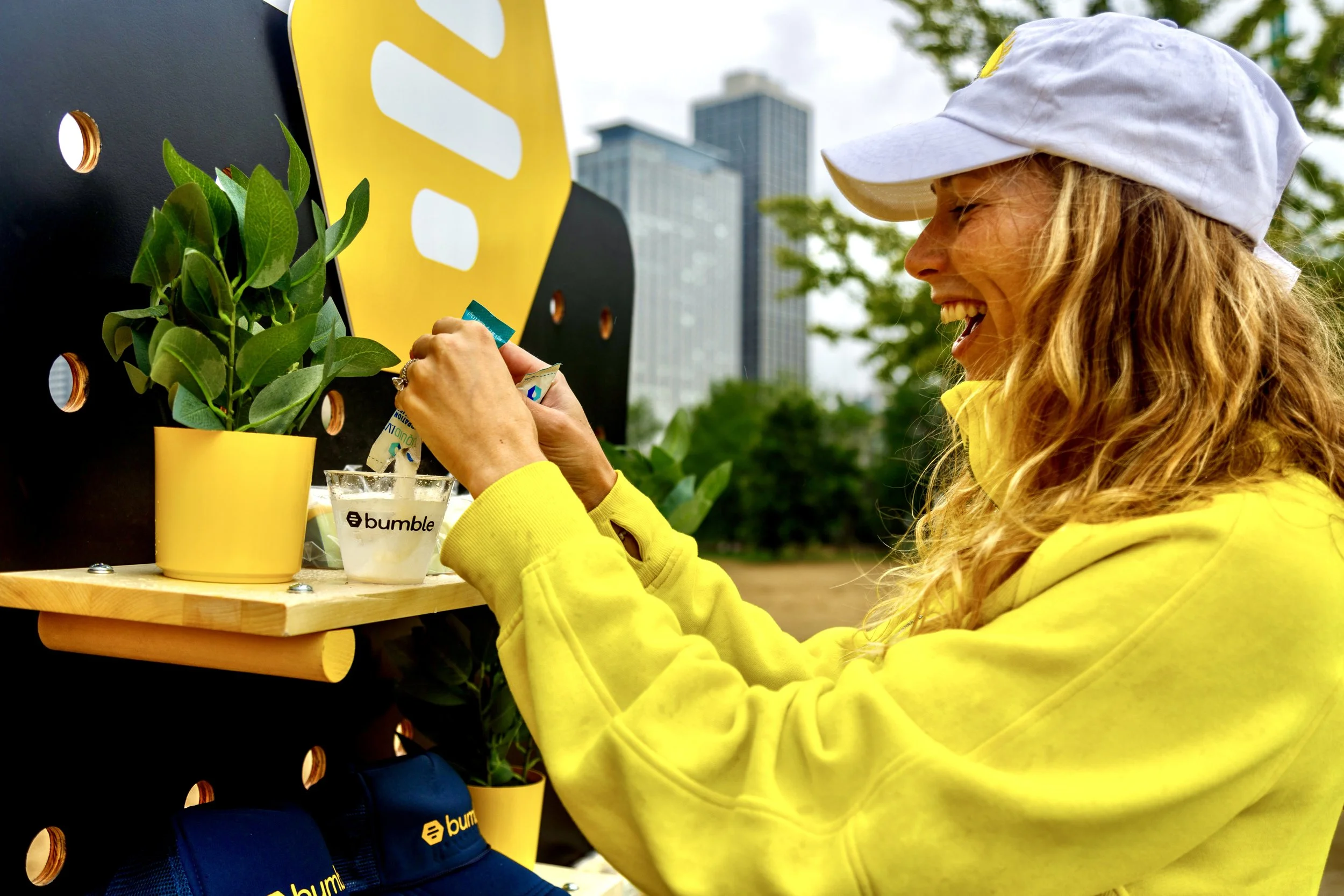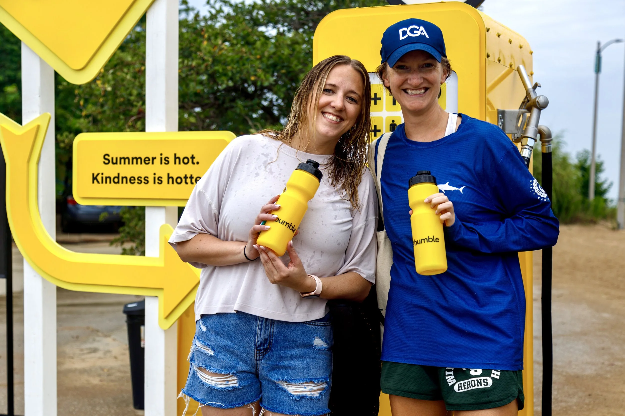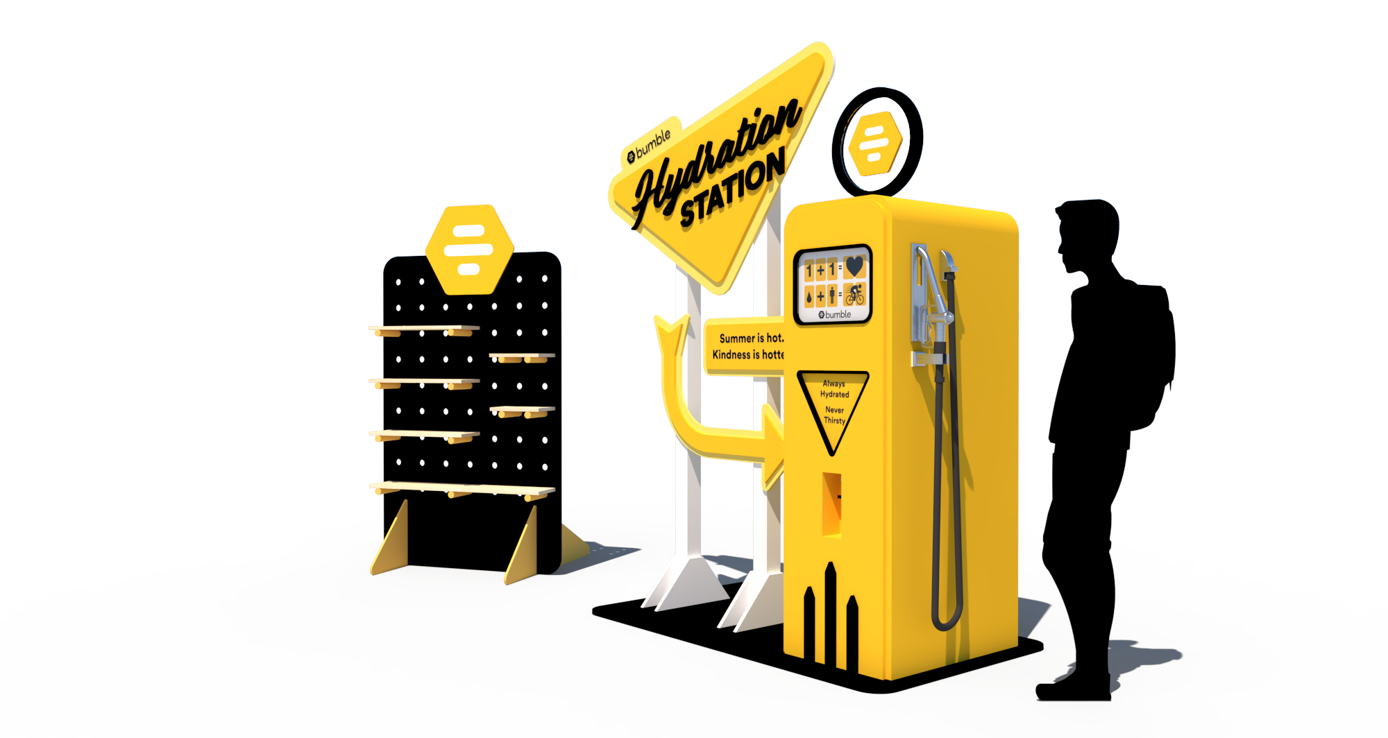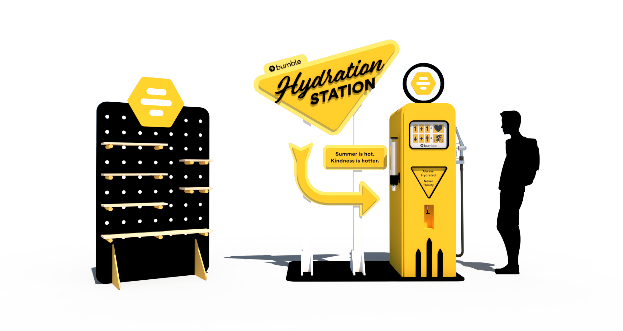 Bumble partnered with Liquid IV to launch their first traveling hydration station. Meant to harken back to a mid-century fuel station, this watering hole wouldn't be out of place on Route 66. This has activated at Chicago parks and will continue to activate the summer of 2023 in various US cities.